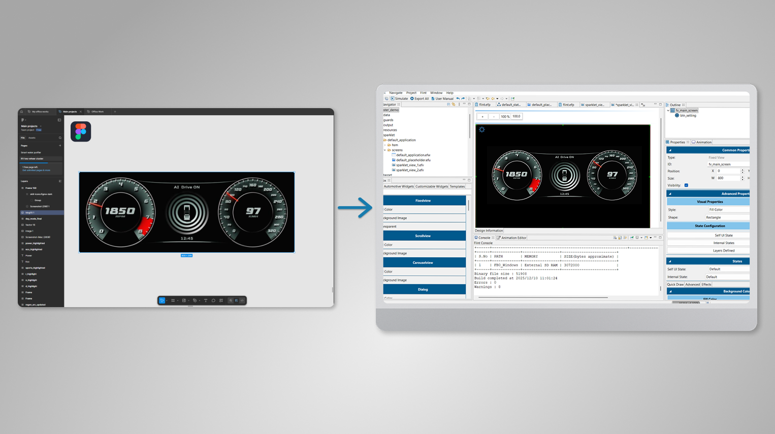 Smart Asset Export: The Figma to Flint plugin streamlines the entire design-to-embedded GUI workflow by automatically exporting pixel-perfect PNG assets optimized for low-memory MCUs and automotive-grade embedded displays. Designers no longer need to manually slice or resize images—the plugin generates pre-compressed, hardware-ready assets ideal for platforms like Renesas RH850, RA, and RZ/A series.